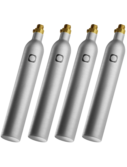 Vier CO₂-Zylinder, gefüllt mit je 425 g Kohlendioxid.