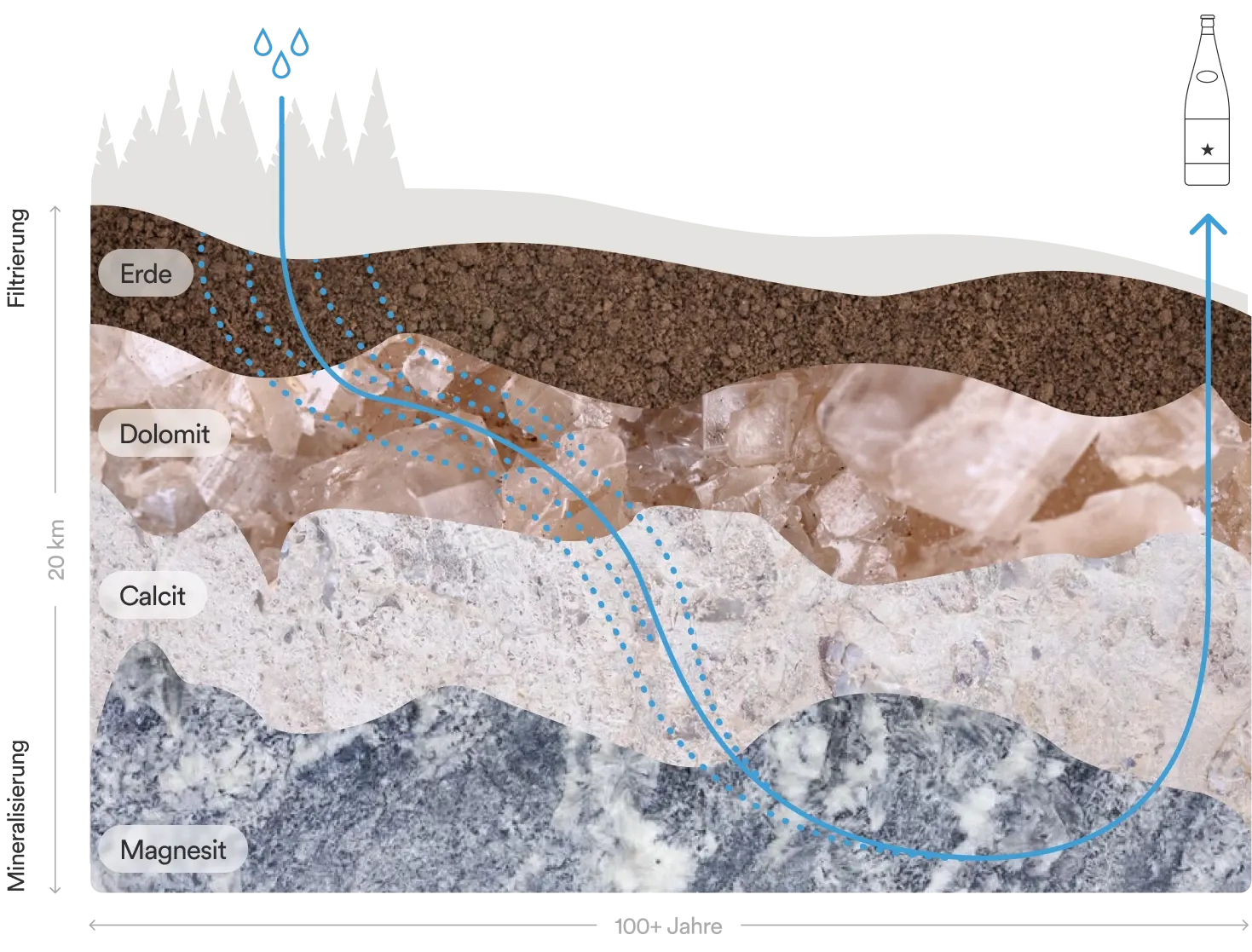 Auf seinem Weg durch Gesteinsschichten wird Regenwasser nicht nur gereinigt wie durch ein feines Sieb. Es wird auch mit Mineralstoffen wie Magnesium, Kalzium oder Natrium angereichert.